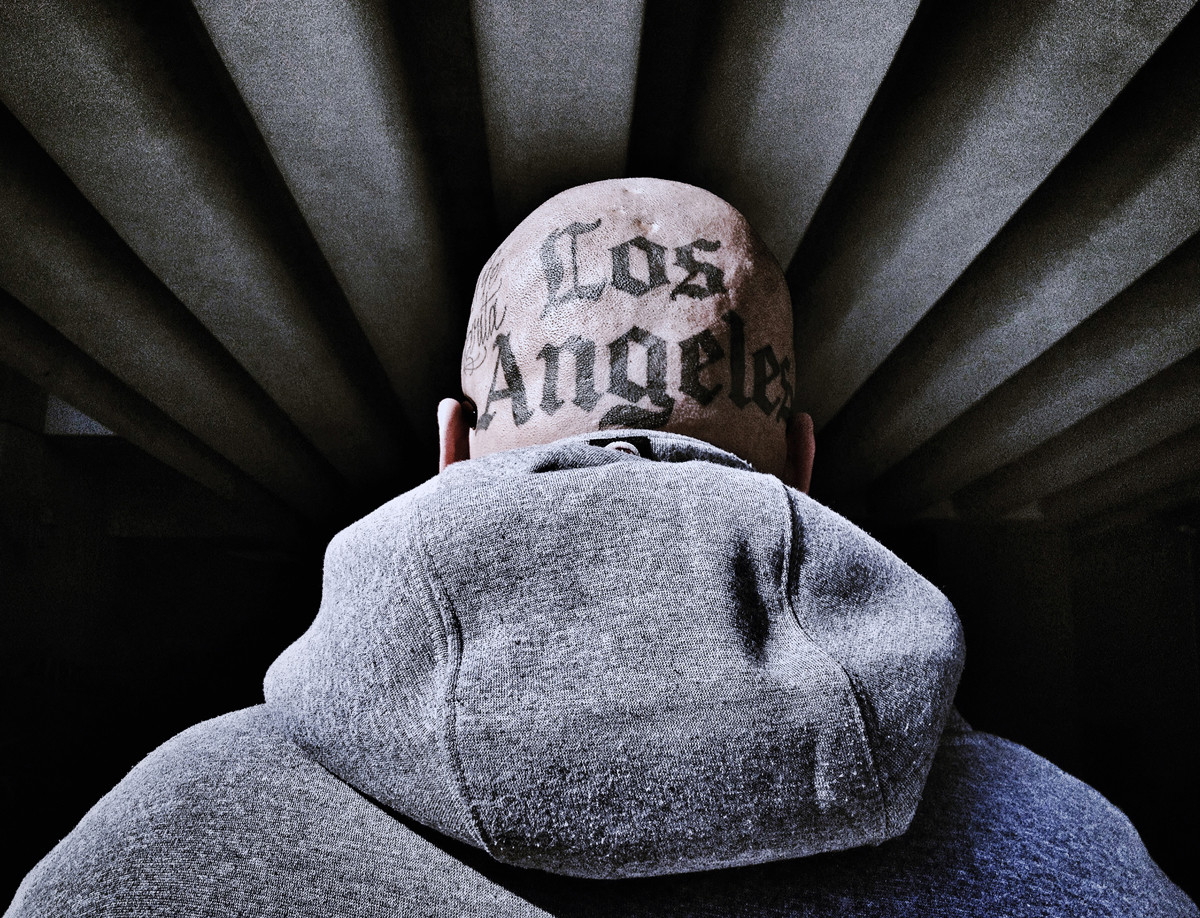 After about nine months of chemotherapy, surgery and then more chemo, I still had thirty-three rounds of daily radiation treatment ahead of me. I knew I didn’t want to drive to Cedars Sinai every day for seven weeks, so the head of radiology set up my treatment at Hollywood Presbyterian, which was two miles round-trip from my apartment. I decided to walk to get my zap every day; it was my full-time part-time job. The image titled Angel was my first radiant person. I saw him while walking home from my eleventh day of radiation. He looked to be a gangbanger: tattoos, bald head, wearing a hoodie. His foreboding presence moved me to ask if I could take his picture. My instincts knew he was much more than his appearance. He was wary when I made the request, but when I took off my hat and he saw my bald head and realized I was a cancer patient he softened and posed for me.