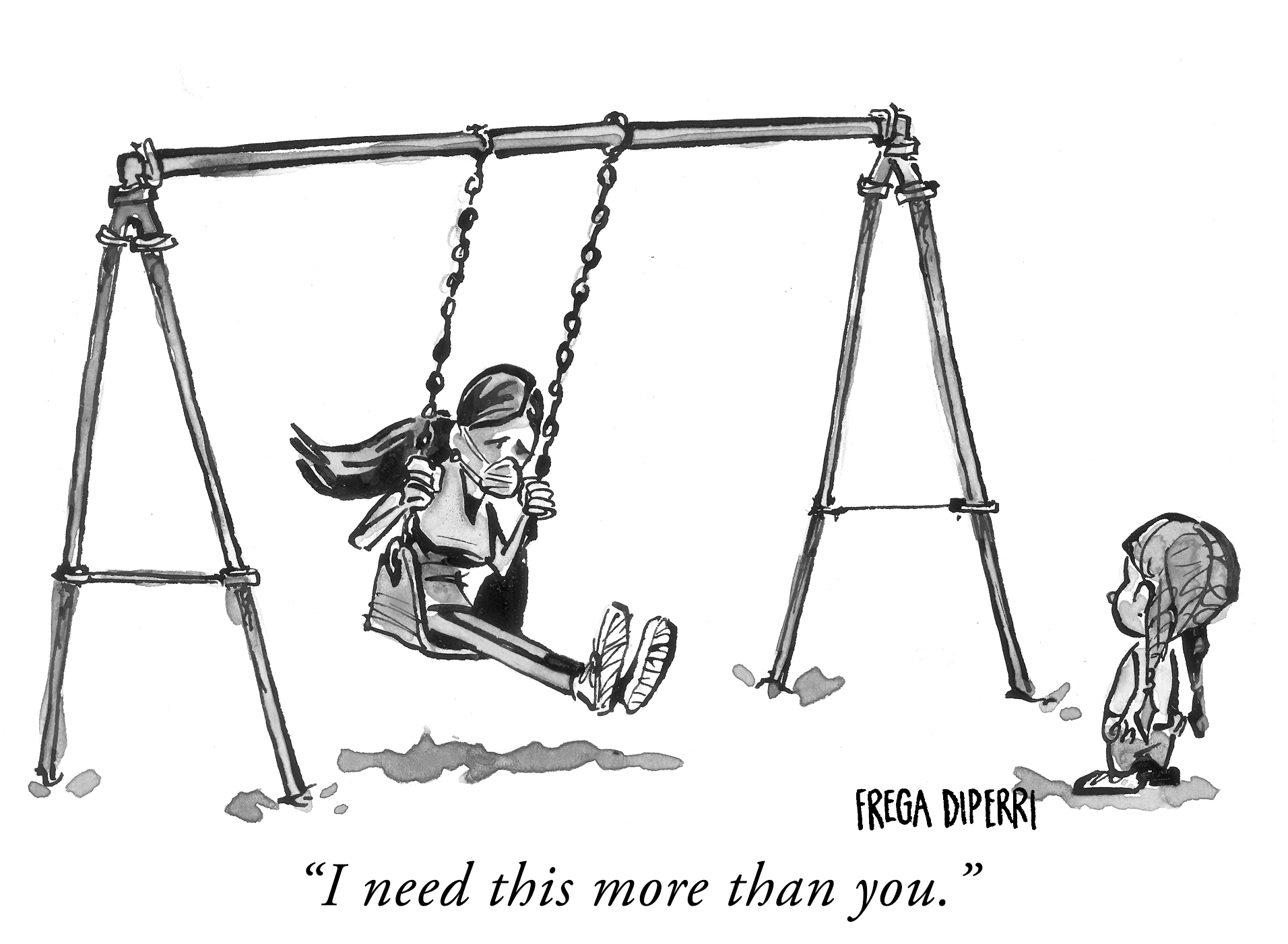 Parenting and living in the pandemic are both emotionally, mentally, and financially challenging. Parenting WHILE living in a pandemic adds a layer of profound exhaustion to these challenges. Our cartoon was crafted to capture this exhaustion and a mother’s need for relief from the weight of these challenges.