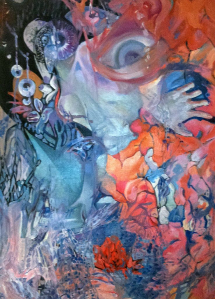 The title of the work is lil peep. The drawing started as an RIP for the recently deceased singer of the same name, who died last year of an overdose. This art is 18×24 mixed media on watercolor paper—primarily acrylic paint and prismacolor markers, with details done in colored pencils. In fact, my own blood was used in the drawing. My fiancé had left me, and dealing with my parents in their old age was too hard for me, so that in a moment of pain I self-cut, something I had done in high school but grew out of. I let the blood drip over the face which I had initially tried to make human, but became more skull-orientated instead. In so many words the best way I can describe this piece is pure pain grief and hopelessness, with a touch or two of insanity. I did not plan the drawing, I emptied my mind and just let it happen. Looking back on it now I see it as a grieving process. Art is such a good way to help heal people; it helps me every day dealing with my addictions. I hope to get better and someday bring hope to other addicts—we all get caught up thinking it’s too late for us and society hates us. Thank you for this opportunity to share with you.