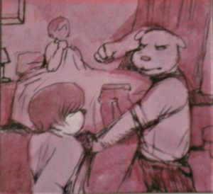 The Pervert is beautifully paced and full of a number of silent panels, as well as full-page borderless panels. The silent panels allow the reader to breathe, and to reflect on the preceding images. The full-page panels and splash pages for the chapter divisions serve as transitions between stages in the growth and development of the narrator and often use a single color, or remain colorless to exhibit mood.