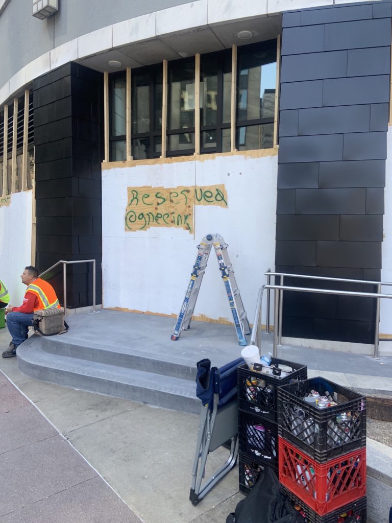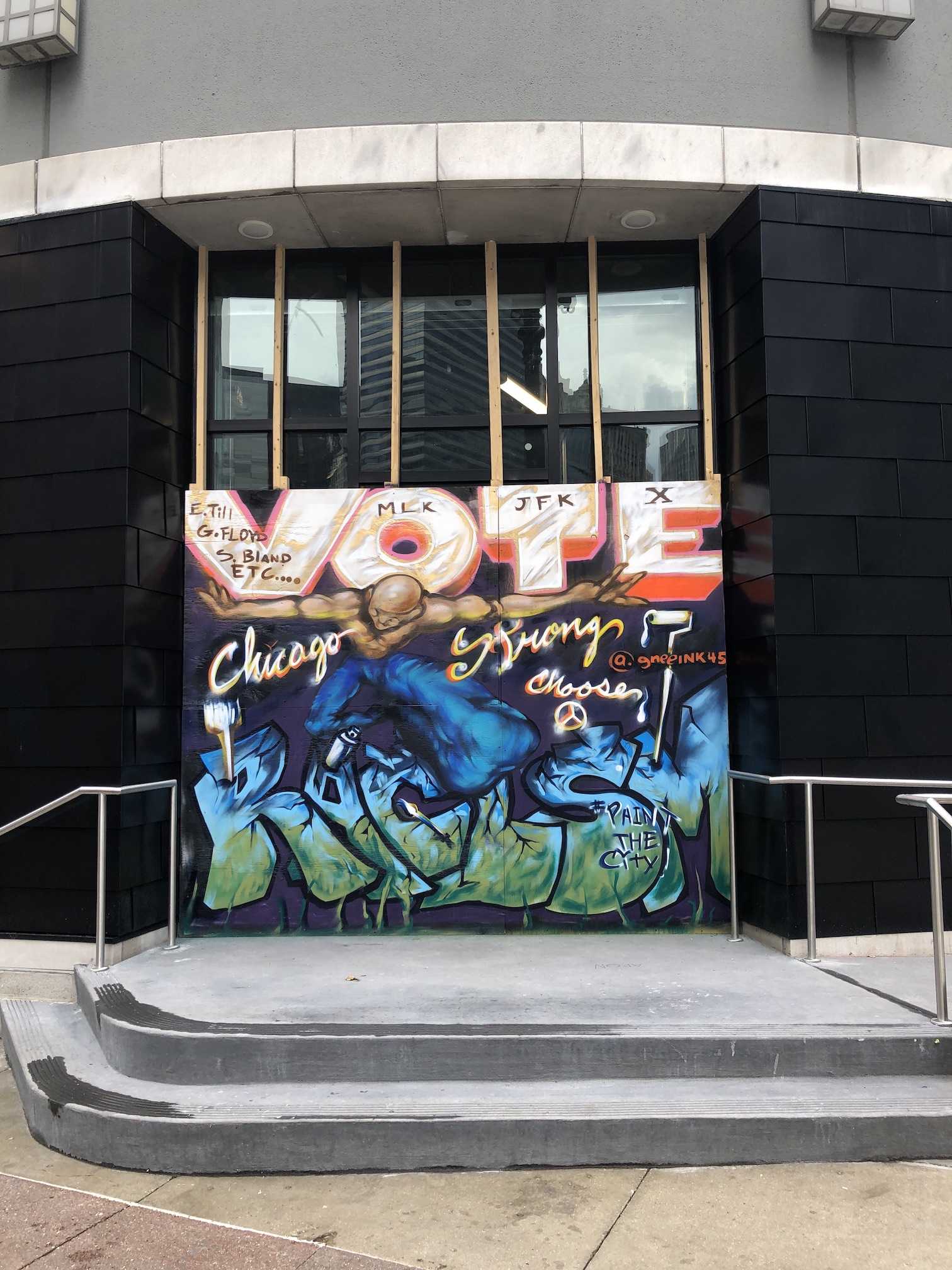 I had been painting “board ups,” or abandoned buildings that have been boarded up, on the South Side of the city to prevent break-ins, and bring light to the area for the Paint the City Project for some time. My first Paint the City mural, after the 2020 protests, was for the Mojo Spa in Wicker Park in early June after it was looted. Organizer, Missy Perkins, aka “The Queen” as I call her, was contacted by the Loop Alliance to improve the face of the city after the high-end stores on Michigan Avenue were looted and damaged. She contacted me because she knows her roster of artists, and knew I would rock it. She let me pick the location I wanted because she’s very aware of who would do something special in the prime locations. My “VOTE” piece created controversy because during the creation of it, someone stopped in the middle of Wacker Drive and started yelling, “We’re all doomed. Doesn’t matter—Democrat or Republican. It’s all been planned out.” Another woman stopped and yelled back, “Let him paint!” The police showed up. You know you’re making a difference when people start talking about your work like that. Art is supposed to spark a fire in people. To make you feel something. I knew this piece was doing what I had intended. The idea for the piece came from thinking about the names on the board—MLK, JFK, Malcolm X—I wanted to uphold their legacy and create a character stomping out racism by holding up the word “Vote.” I painted the word “racism” in green because it’s rooted in the earth of this country; the only way to uproot it is to be aware, to vote, to create art and music, to read, talk, and dance! It’s the power of the VOTE that will crush racism. Our artist’s tools in the mural are helping to crush racism too. We have to utilize every tool in the book to stop the deeply embedded racism because we’ve all been “Willie Lynch-ed” in the mind. For those unfamiliar with how this saying came about, there was a wealthy, white, slave owner who taught people how to control slaves…by turning them against one another, and these tricks and tactics have worked over time. We all need to be aware that these ideals have been ingrained in all of us.