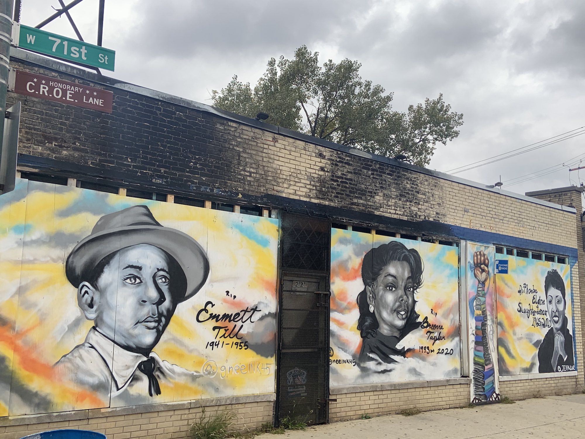 On the front of the building, on the 71st Street side, I painted Emmett Till and Breonna Taylor to show the history, and to honor them both and pay respect; to show that all life is precious. The fist resting on books was done in 2015 to show that reading gives power. I was going to go back and add more detail to that element, but when the message is there nothing else needs to be done. I always go back to that wall because it’s the melting pot corner of Englewood: Black, white, LatinX, all pass by. It’s a very powerful corner, and I wanted the message to be very visible to people of all races.
