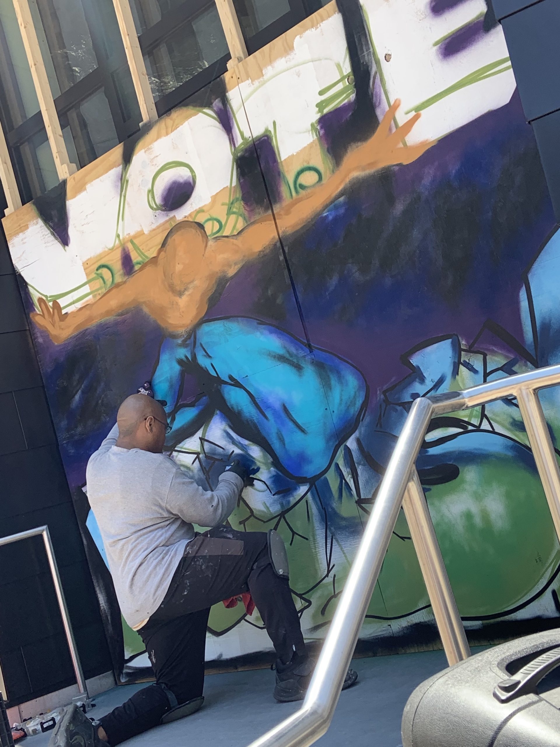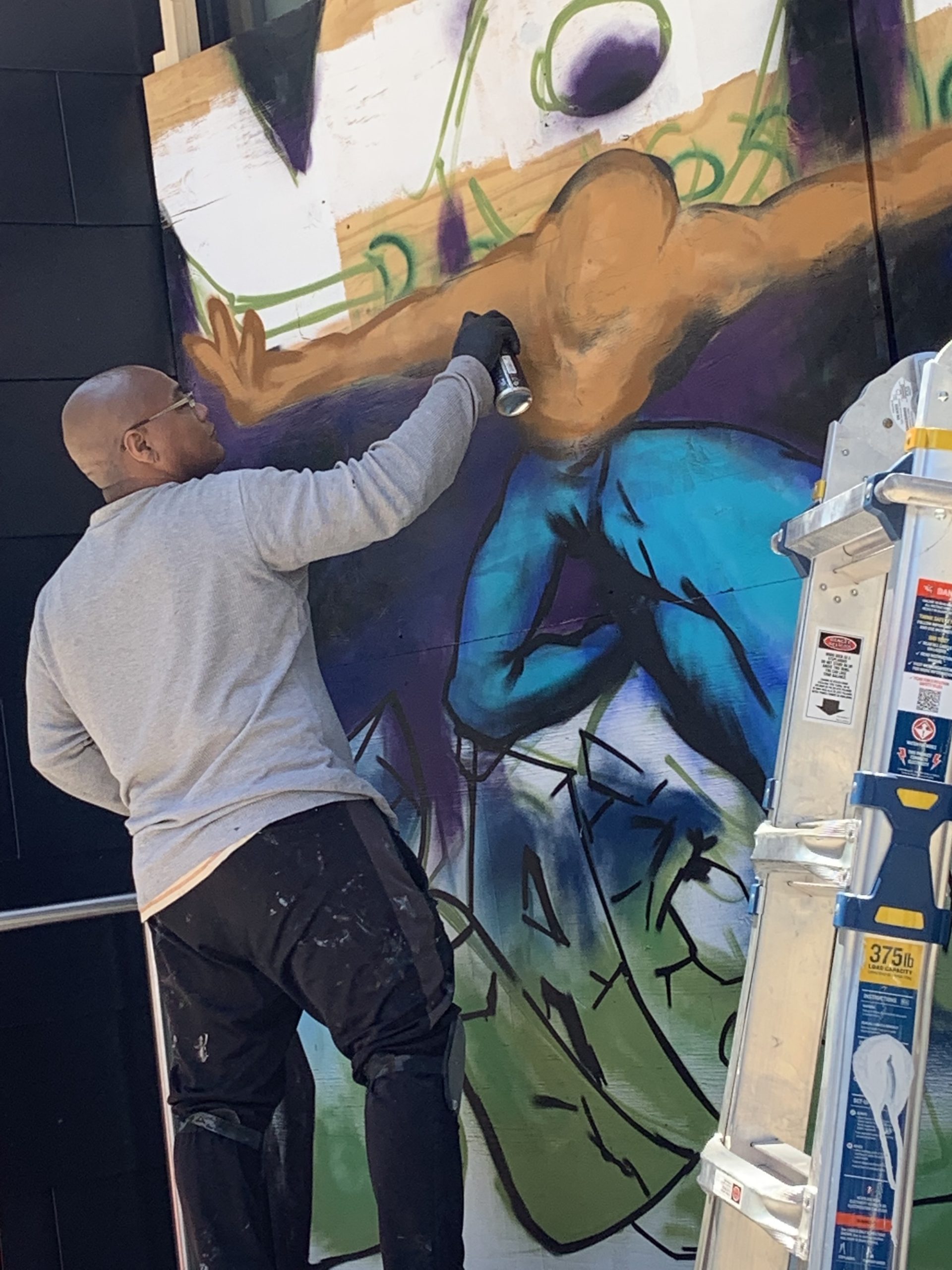 Bold, incredible, exhilarating, bright and colorful are words that are used to describe his work. Using the spray can as a football, Jones passes on positive vibes through color, powerful portraits and positive collaborative efforts to communicate the need for social and community development! Incorporating past subject matter with a modern-day twist, creating new and inspiring images is what Jones does with passion.