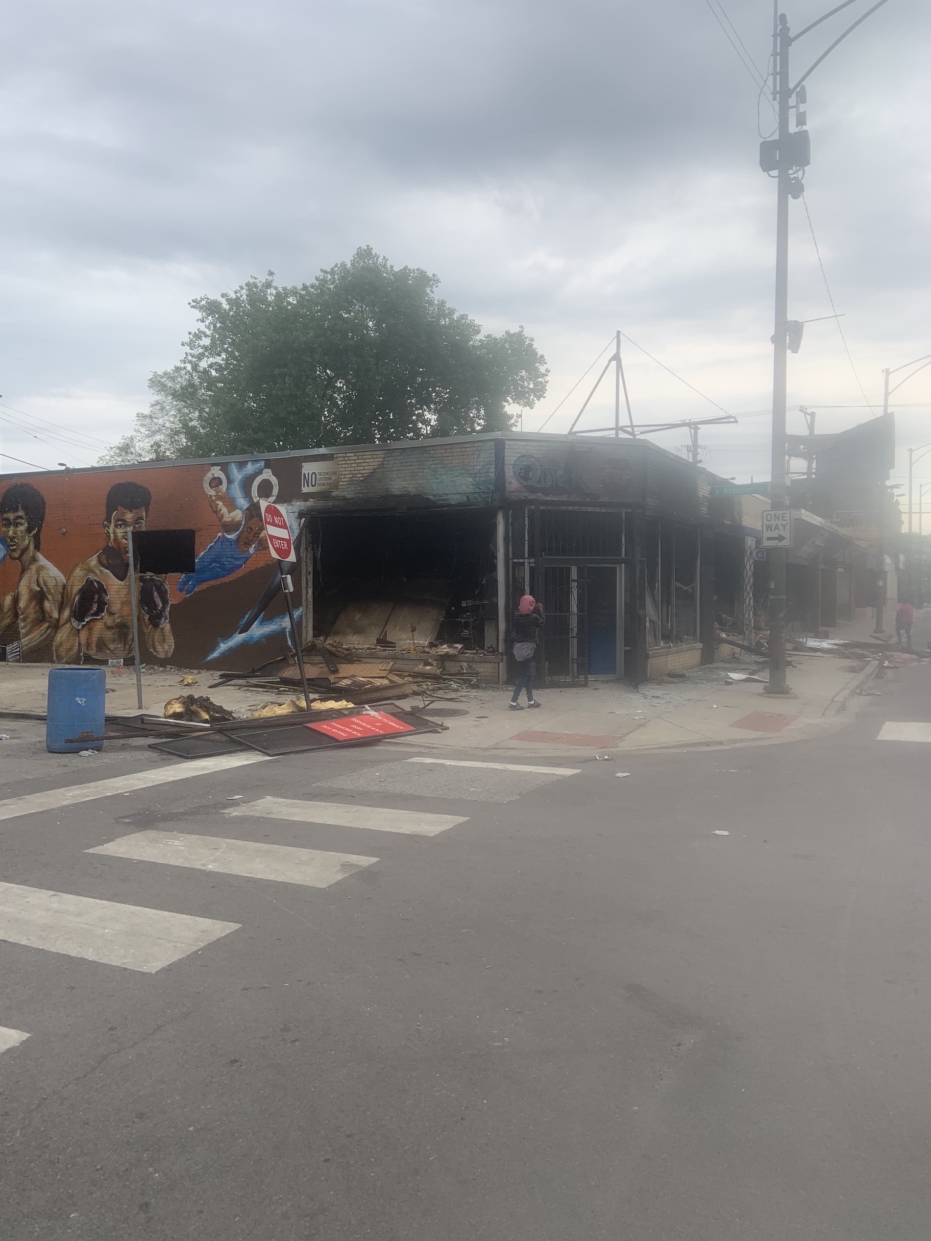 During the summer of 2020 the Quick Stop was burned down, robbed, and looted by neighbors. The existing image of Muhammed Ali, Bruce Lee, Kobe Bryant and his daughter along with seven birds for others lost in that tragedy, Serena Williams, along with gymnast, Olympic hopeful and son of local Unisex Salon owner, Winston Matthew, remained intact. Matthew’s Unisex Salon is in that complex too, and by including his son it showed that someone from our neighborhood could achieve that level of excellence and greatness. Matthew’s Salon was not touched during the rioting because the neighborhood respected him. The restaurant next door, Baba’s, was left untouched because it’s a food source. The community has calmed down, realizing that destroying the businesses in the area is counterproductive. Recently, Muhammed Ali’s wife visited Chicago and saw the mural, and was blown away by it. She contacted our alderman, who reached out not realizing that the art had been created by someone in the neighborhood. Mrs. Ali asked that it never be painted over. Art helps people feel better—I’m going to keep doing it. I’d like to paint murals 360 degrees around the entire building.
